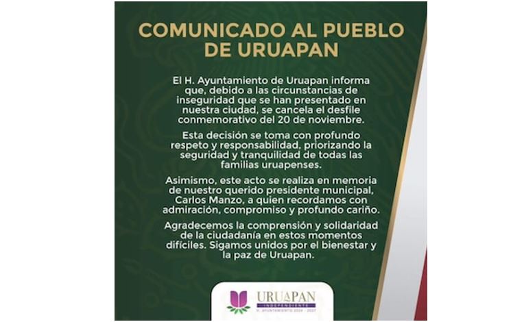 El Ayuntamiento de Uruapan, Michoacán, anunció la cancelación del desfile cívico del 20 de noviembre, c