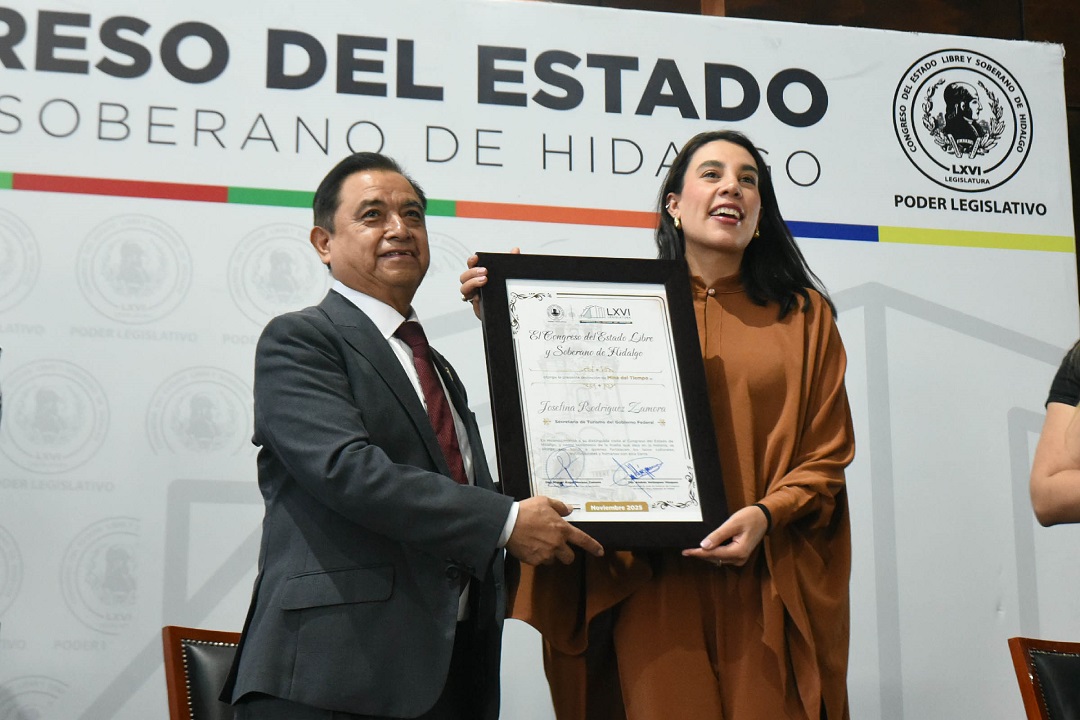 Pachuca de Soto, Hidalgo; 13 de noviembre de 2025.- El Congreso del Estado Libre y Soberano de Hidalgo entregó por primera vez en su historia, la distinción “La Mina del Tiempo” a la secretaria de Turismo del Gobierno de México, Josefina Rodríguez Zamora, por sus logros en materia de sustentabilidad, lo que genera un impacto medible a la conservación de recursos naturales y culturales del país.