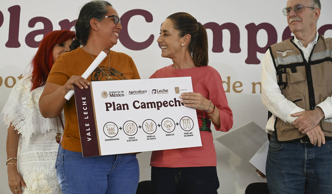 Ciudad de México, 15 de noviembre de 2025.- Desde Champotón, en cumplimiento a un compromiso de campaña, la Presidenta de México, Claudia Sheinbaum, encabezó el arranque del Plan Campeche, el cual a través de una inversión histórica de mil 238 millones de pesos (mdp), beneficiará a 7 mil 881 productoras y productores de pequeña escala de leche, arroz y carne, con el objetivo de impulsar al campo, el empleo rural y fortalecer la soberanía alimentaria.