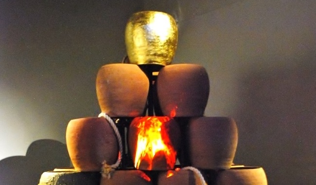 Destaca una instalación multimedia compuesta por 45 ollas de barro apiladas en forma de pirámide, sobre las cuales se proyecta un video de fuego vivo, elemento fundamental en la cocina. Las ollas son de uso cotidiano en las cocinas del Istmo de Tehuantepec, donde se prepara el maíz, alimento principal de México desde tiempos prehispánicos.