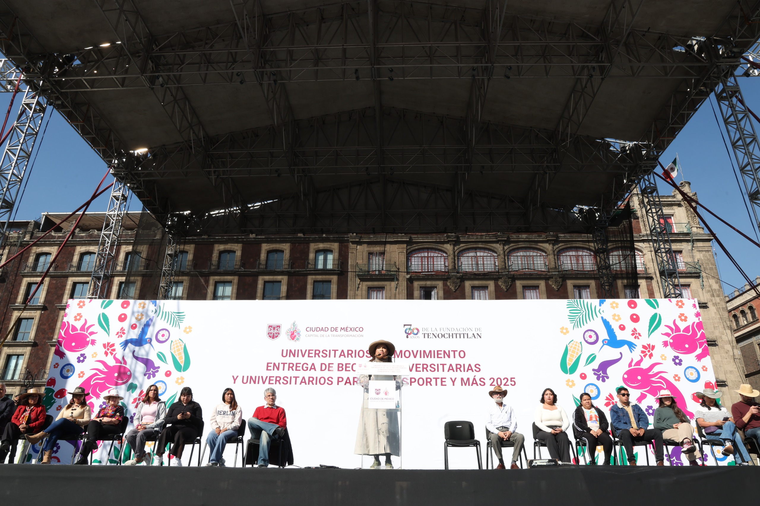 Ciudad de México, 17 de noviembre de 2025.- La Jefa de Gobierno, Clara Brugada Molina, encabezó en el Zócalo capitalino la entrega del apoyo Beca a Universitarias y Universitarios para Transporte y Más de escuelas públicas, programa que calificó como verdaderamente universal, dirigido a todas y todos los estudiantes que cumplan con dos requisitos: estudiar en una institución pública de nivel superior y vivir en la Ciudad de México.