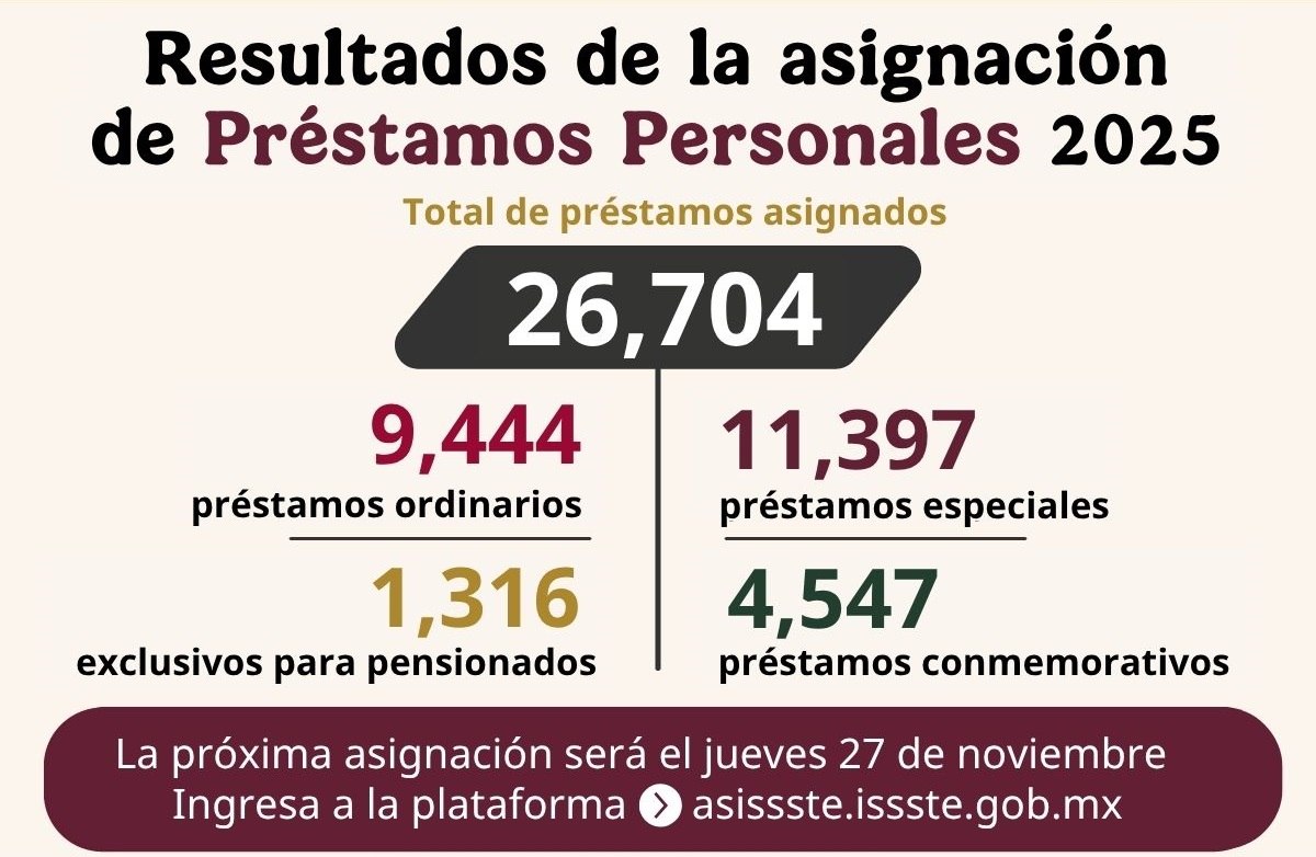 Ciudad de México, a 18 de noviembre de 2025.- El Instituto de Seguridad y Servicios Sociales de los Trabajadores del Estado (ISSSTE), encabezado por el director general Martí Batres Guadarrama, informa que se asignaron 26 mil 704 créditos en el Programa Anual de Préstamos Personales 2025, es decir, todos aquellos que cumplieron los requisitos.
