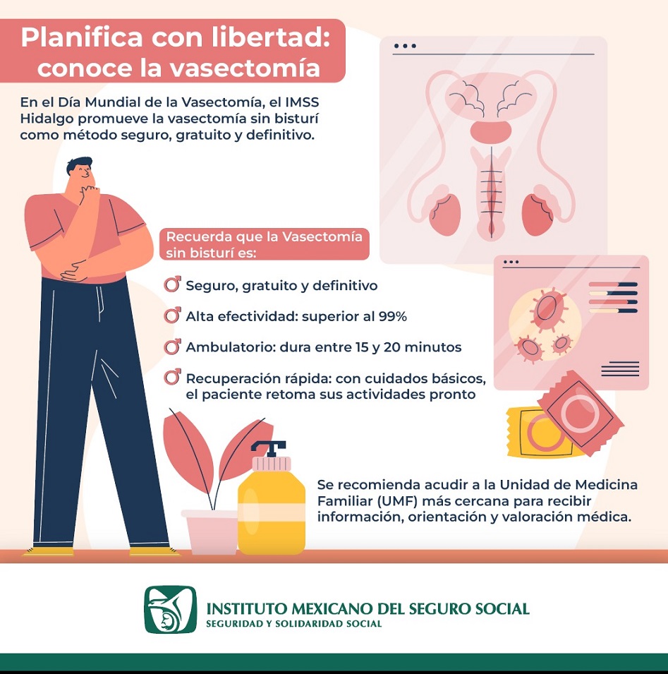 Pachuca, Hidalgo, 20 de noviembre de 2025.- En el marco del Día Mundial de la Vasectomía, 21 de noviembre, el Instituto Mexicano del Seguro Social (IMSS) en Hidalgo destacó la importancia de esta práctica como un método de planificación familiar, el cual es seguro, gratuito y definitivo para los hombres que han decidido no tener hijos o han alcanzado el número deseado.