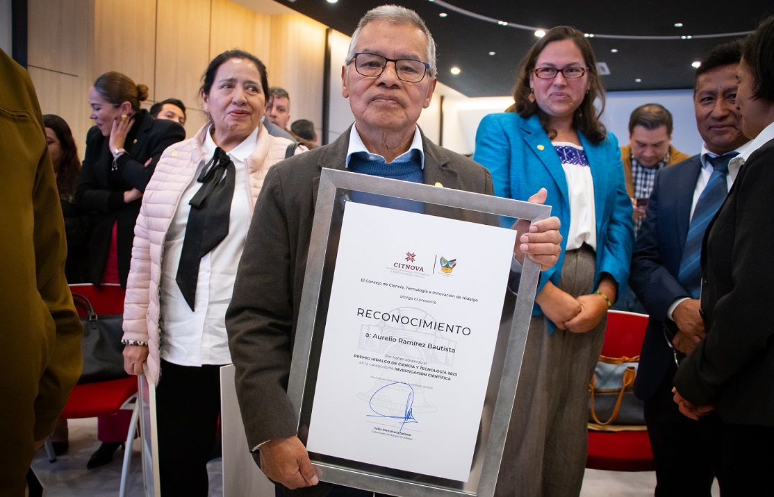 Pachuca de Soto, Hgo., 22 de noviembre de 2025. En la categoría de Investigación Científica, el biólogo hidalguense y SNI emérito, doctor Aurelio Ramírez Bautista, fue reconocido por su sobresaliente trayectoria académica y científica, respaldada por más de 300 publicaciones, 4 mil 452 citas y un profundo compromiso con la formación de nuevas generaciones de especialistas en biodiversidad.