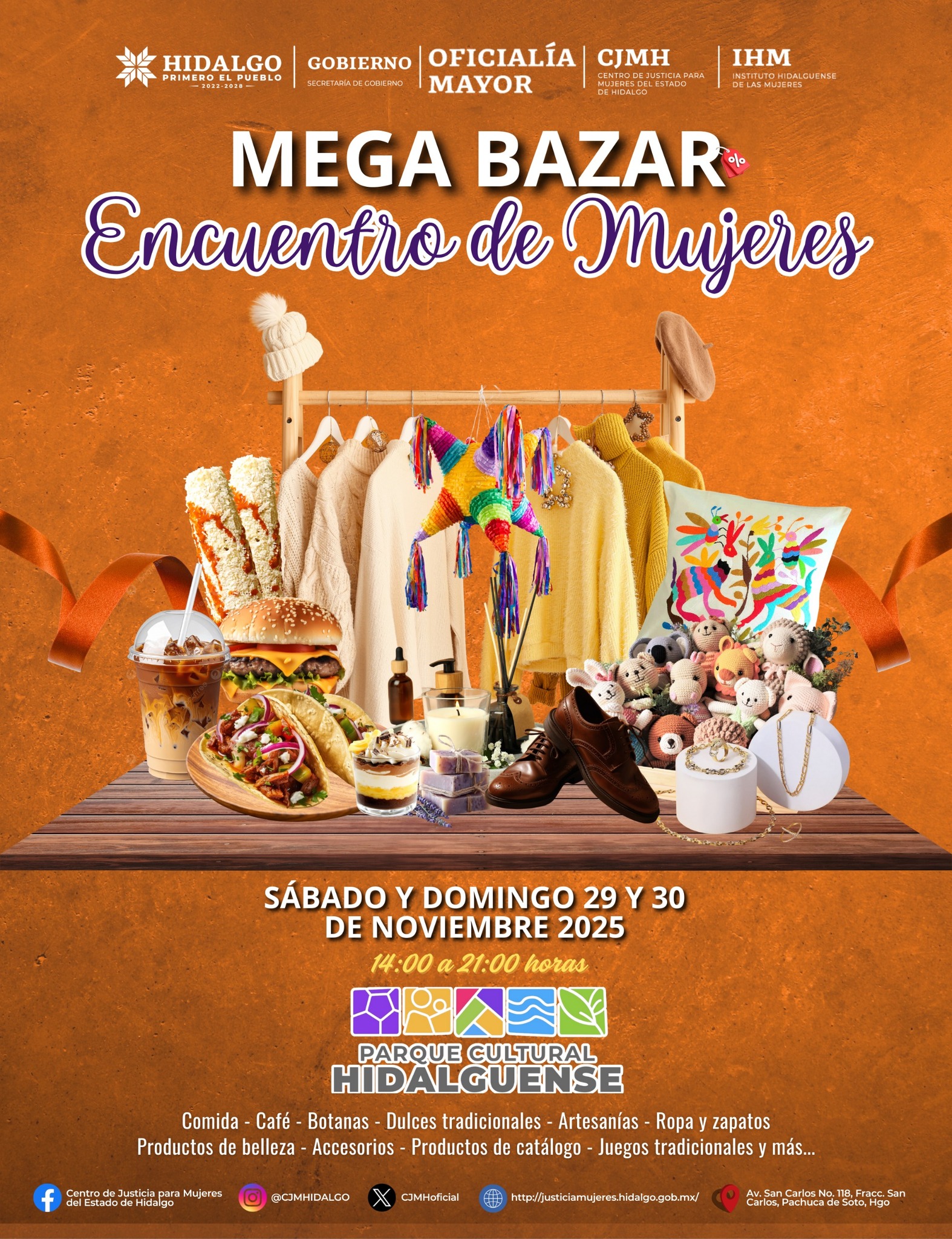 Con el objetivo de impulsar la autonomía económica de las hidalguenses y fortalecer su independencia, el Gobierno del Estado de Hidalgo invita a la ciudadanía a participar en el Mega Bazar “Encuentro de Mujeres”, que se llevará a cabo este sábado y domingo, de 14:00 a 21:00 horas, en el Parque Cultural Hidalguense.