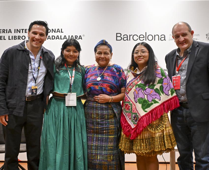 En esta mesa, organizada por el Centro de Estudios Estratégicos para el Desarrollo (CEED), del Centro Universitario de Ciencias Sociales y Humanidades (CUCSH), participaron la Premio Nobel de la Paz (1992), Rigoberta Menchú; el representante de la UNICEF en México, Fernando Carrera Castro; la joven de origen mazahua y promotora cultural Natalia Velázquez Ramírez; la joven wixarika y artesana Anahí Carrillo Reza, y Omar Avilés González, Director del CEED, quien fungió como moderador.