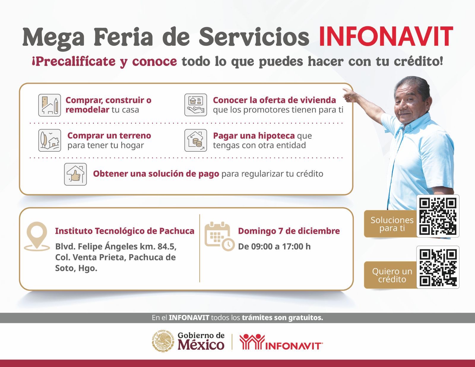 Pachuca, Hidalgo 1 de diciembre de 2025.- El INFONAVIT realizará su última Mega Feria de Servicios en el municipio de Pachuca, Hidalgo, con el objetivo de acercar sus diferentes productos de financiamiento a las y los derechohabientes.