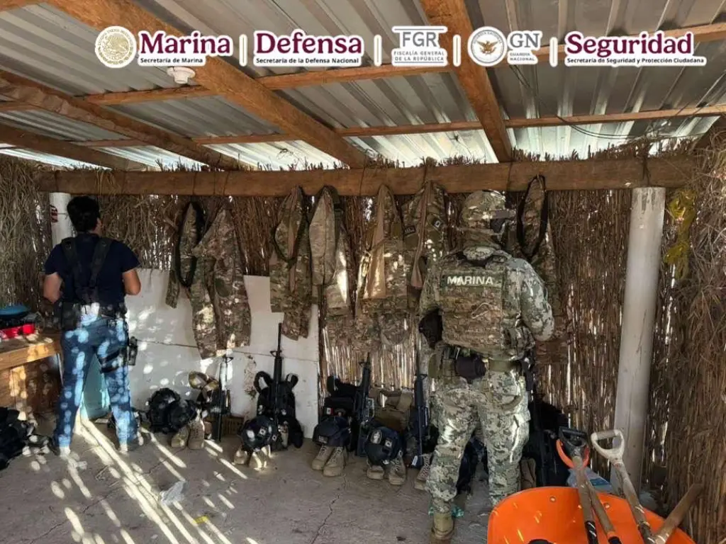 Durante la intervención se aseguraron seis armas largas, 27 cargadores, 760 cartuchos útiles, 13 chalecos balísticos, 19 cascos balísticos, 14 pares de botas, diverso equipo táctico y 54 dosis de metanfetamina.