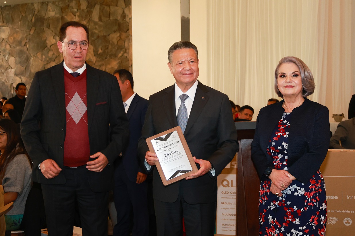 Pachuca de Soto, Hgo., 16 de diciembre de 2025. El gobernador Julio Menchaca Salazar acompañó a la presidenta del Tribunal Superior de Justicia del Estado de Hidalgo (TSJEH), Rebeca Stella Aladro Echeverría, a la entrega de reconocimientos por 25, 30 y 40 años de servicio a integrantes del Poder Judicial estatal, quienes con compromiso, esfuerzo y dedicación intervienen en la impartición de justicia en la entidad.