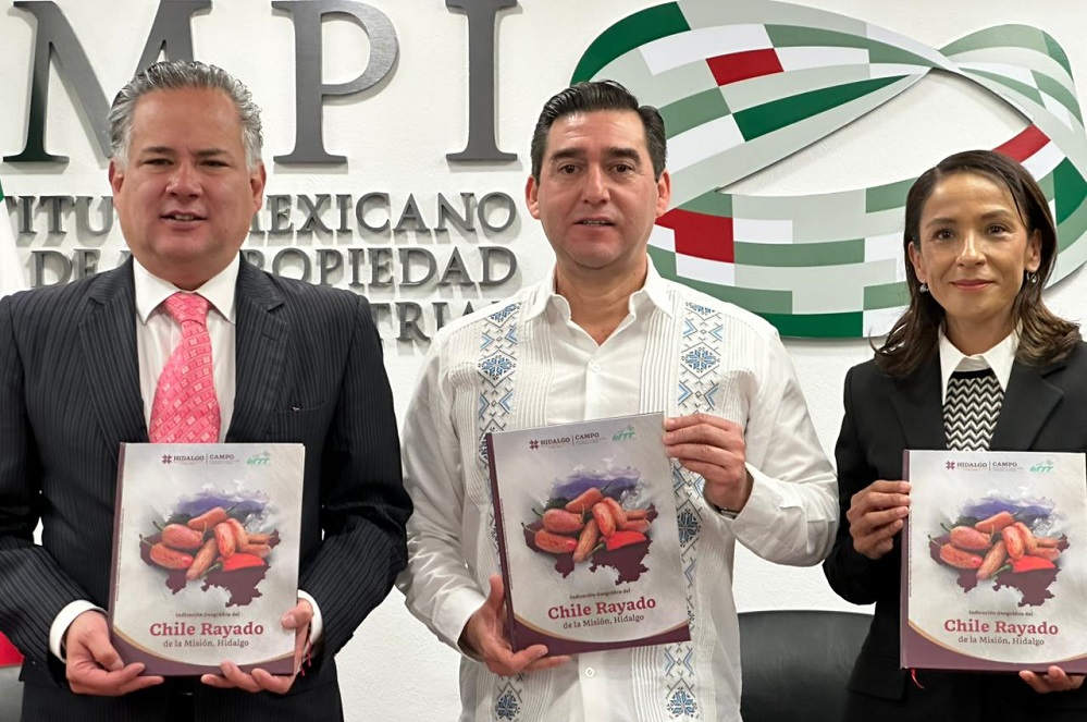 Ciudad de México, 17 de diciembre de 2025. El titular de la Secretaría de Agricultura y Desarrollo Rural de Hidalgo (Saderh), Napoleón González Pérez, realizó la entrega física del expediente técnico elaborado por la Universidad Tecnológica de Tula-Tepeji, así como de la solicitud para la Declaración de Protección de la Indicación Geográfica “Chile Rayado de La Misión, Hidalgo”, ante el Instituto Mexicano de la Propiedad Industrial (IMPI).