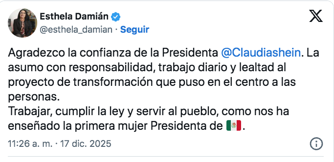 El anuncio fue dado a conocer por el Gobierno de México a través de redes sociales. Tras el nombramiento, Esthela Damián agradeció la confianza de la mandataria y afirmó que asume esta nueva responsabilidad con compromiso, lealtad y responsabilidad, en concordancia con el proyecto de transformación del país.