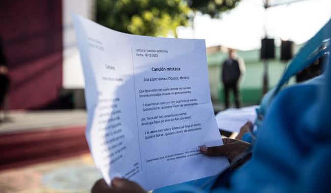 El titular de la SEP compartió con las y los estudiantes un fragmento de “Los emigrantes, ahora” del escritor uruguayo Eduardo Galeano, y encabezó la lectura colectiva con maestros, estudiantes y padres de familia del poema “Cantares” del español Antonio Machado.