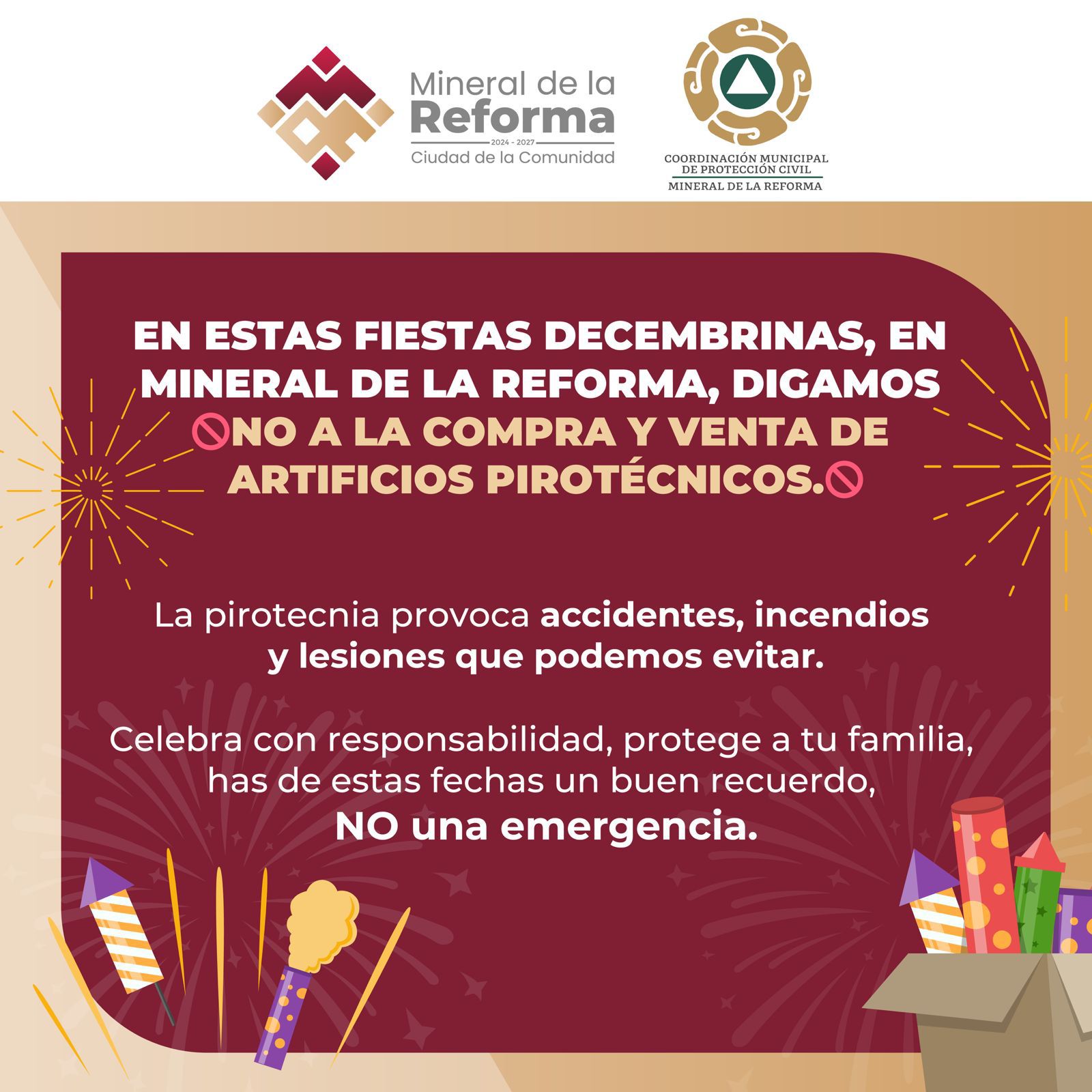 En esta temporada de fiestas navideñas y de fin de año, el Ayuntamiento de Mineral de la Reforma hace un atento llamado a la población para evitar la adquisición, comercialización, almacenamiento y uso de productos pirotécnicos.