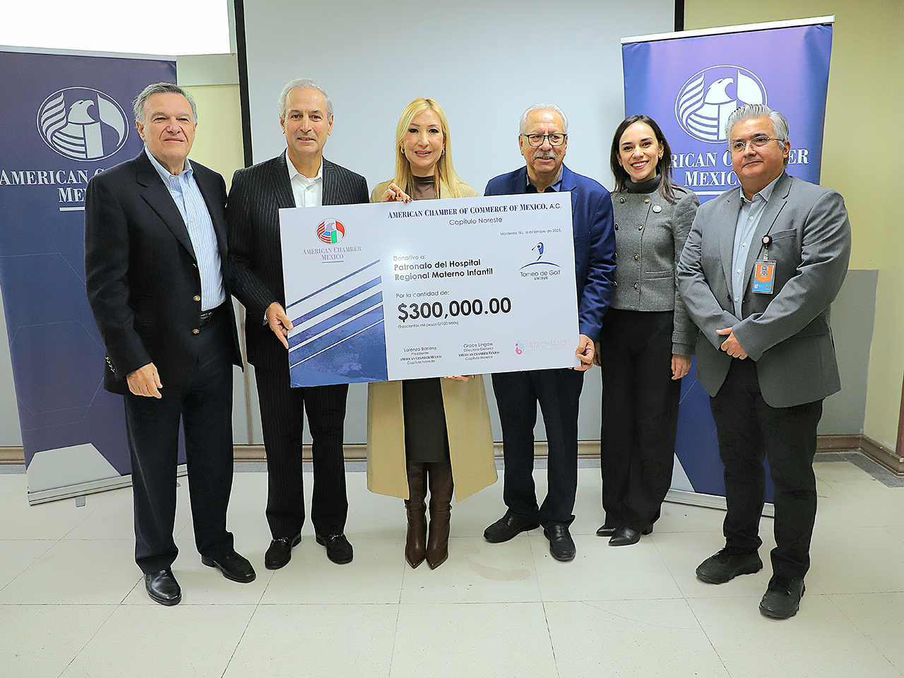 La entrega de este donativo se llevó a cabo de manera simbólica por parte de AMCHAM Noreste, encabezada por su presidente, Lorenzo Barrera Segovia y el Consejero Ricardo Martín Bringas, en representación del Patronato del Hospital Materno Infantil.