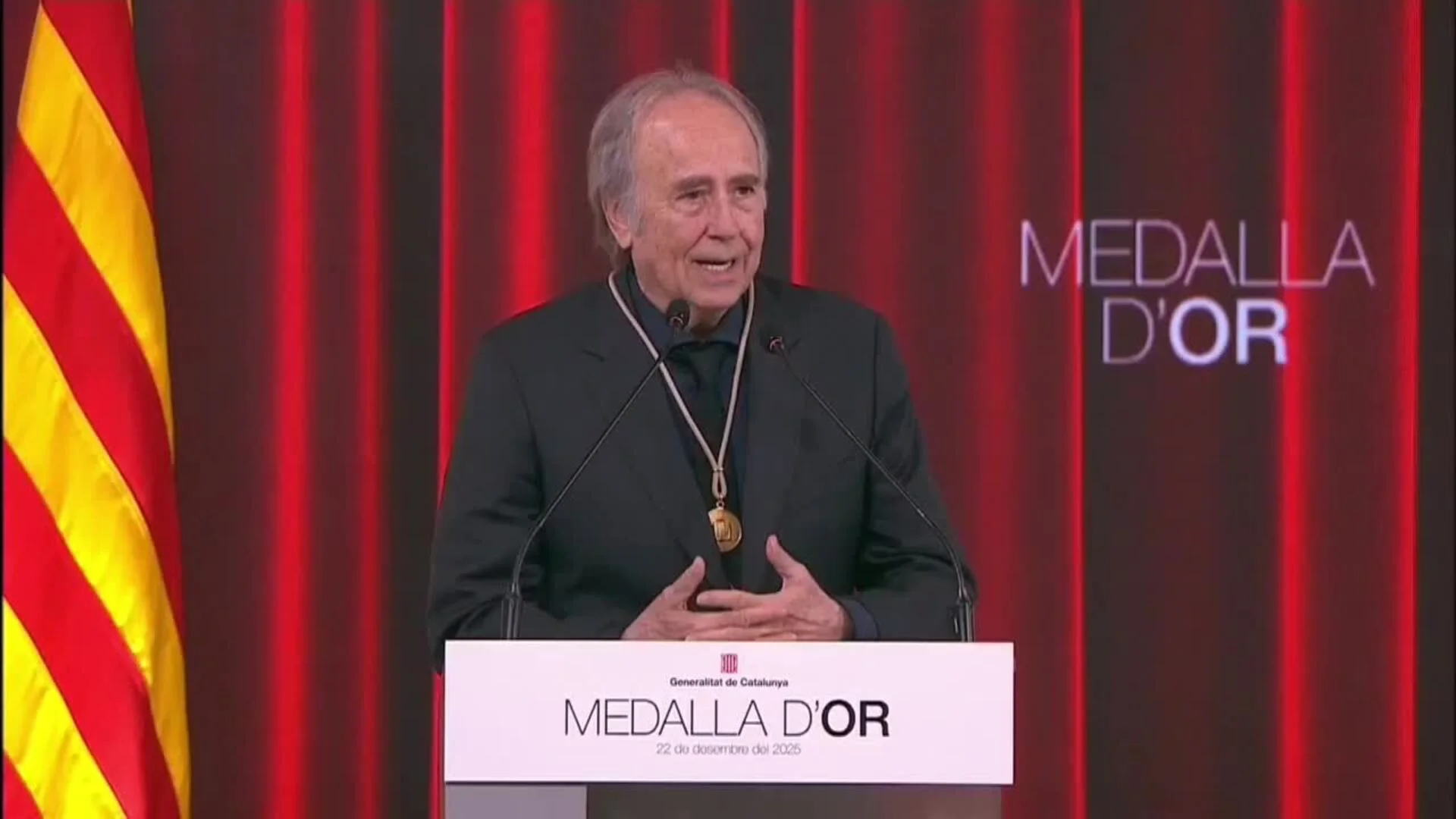 Madrid, 23 de diciembre del 2025.- El músico y poeta Joan Manuel Serrat recibió en Barcelona la Medalla de Oro de la Generalitat de Cataluña, una de las máximas distinciones otorgadas por las instituciones de la comunidad autónoma, en reconocimiento a su trayectoria artística y a su compromiso cívico y cultural. En el mismo acto fue galardonada la actriz Núria Espert, figura destacada de la escena teatral contemporánea en España.