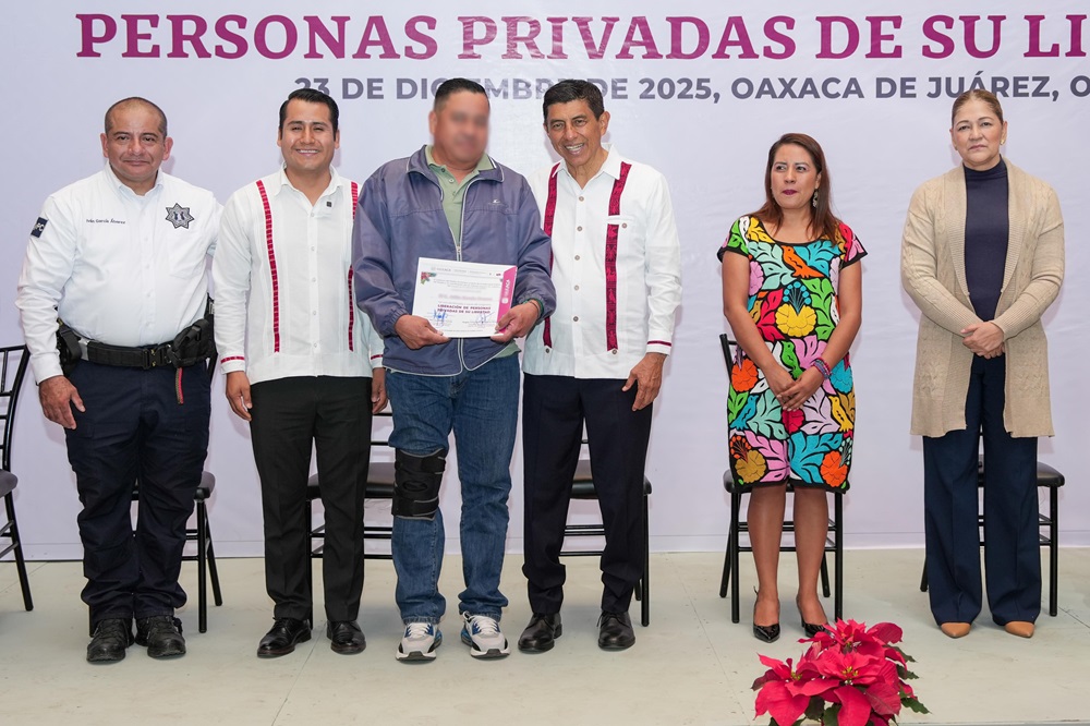 Oaxaca de Juárez, Oax. 26 de diciembre de 2025.-En un acto de justicia social, resultado de un trabajo responsable, profesional y comprometido con las leyes y la dignidad humana; el Gobernador Salomón Jara Cruz entregó de manera simbólica, 6 de 121 constancias de liberación a personas indígenas y de escasos recursos, privadas de su libertad, condenadas por actos menores.