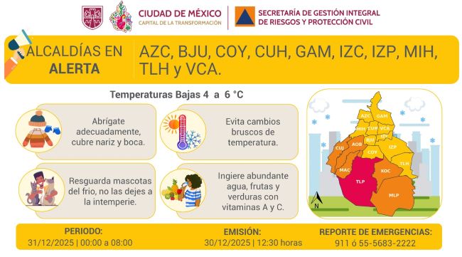 Ciudad de México, 31 de diciembre de 2025.- La Secretaría de Gestión Integral de Riesgos y Protección Civil informa que se activa ALERTA ROJA por pronóstico de temperaturas bajas para la madrugada y la mañana del miércoles 31/12/2025, en la demarcación Tlalpan. Se pronostican temperaturas de entre -2 a 0 grados Celsius y heladas, entre las 00:00 horas y las 08:00 horas.