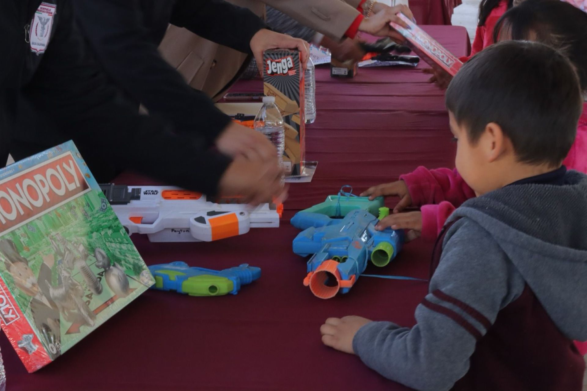En tanto, personal de Gobernación recibe de manos de niñas y niños, los juguetes bélicos, que son canjeados por educativos.