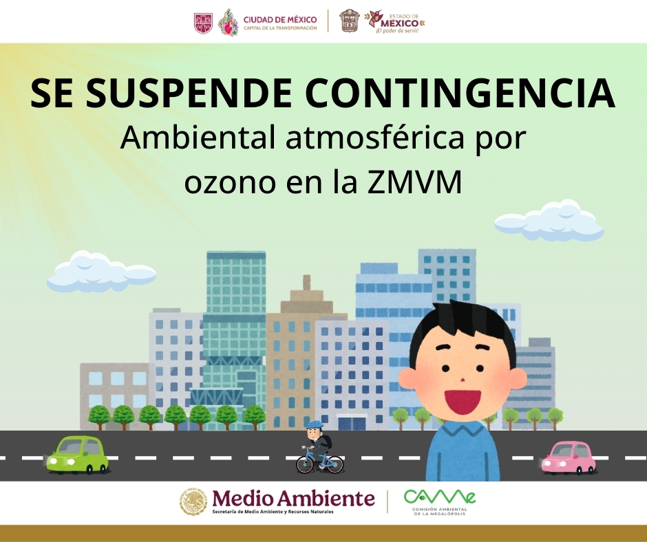 Por lo anterior, de conformidad con lo establecido en los Programas para Prevenir y Responder a Contingencias Ambientales Atmosféricas que aplican en la Zona Metropolitana del Valle de México, la Comisión Ambiental de la Megalópolis (CAMe) informa que se suspende la contingencia ambiental atmosférica regional por partículas PM2.5 en la zona Sureste del Valle de México.