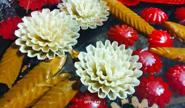 Las flores escamadas se elaboran por pétalo, mediante moldes de madera tallados a mano, que se humedecen antes de sumergirse en la cera caliente. “Una rosa puede llevar hasta cuarenta pétalos”, detalla. En el caso de los sirios, el trabajo es aún más minucioso: las capas de cera se vierten sobre un pabilo de algodón, con cuidado del grosor y la forma durante semanas de trabajo continuo.