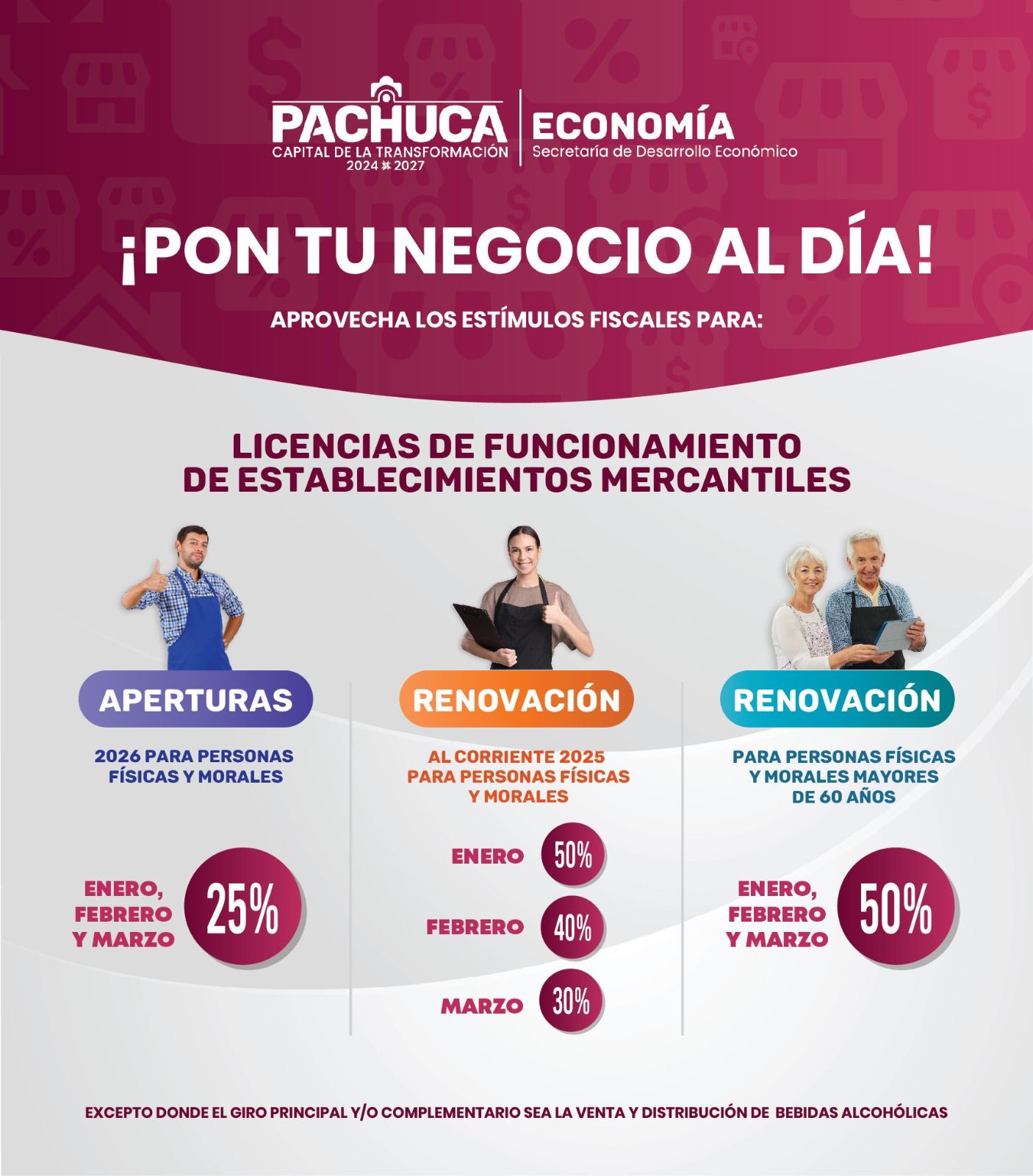 Pachuca de Soto 16 de enero de 2026.- Con el propósito de facilitar los trámites y fortalecer el orden de la actividad comercial, el Ayuntamiento de Pachuca mantiene vigentes los estímulos fiscales para licencias de funcionamiento de establecimientos mercantiles, orientados a promover la regularización y el desarrollo económico formal en el municipio.