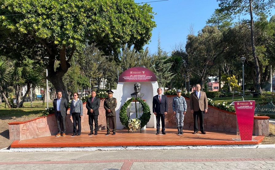 Pachuca de Soto, Hgo., 05 de febrero de 2026. En representación del gobernador Julio Menchaca Salazar, el secretario de Agricultura y Desarrollo Rural, Napoleón González Pérez, acudió a la ceremonia por el 28.° aniversario luctuoso de Vicente Aguirre del Castillo, exmandatario estatal, frente al busto en su honor que se ubica en el Parque Hidalgo, en la ciudad de Pachuca.