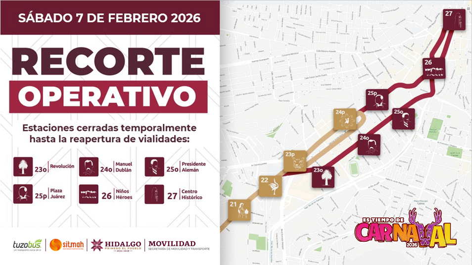 Zempoala, Hidalgo, a 5 de febrero de 2026.- La Secretaría de Movilidad y Transporte, a través de su organismo sectorizado, el Sistema Integrado de Transporte Masivo de Hidalgo (Sitmah), estableció medidas operativas y logísticas en torno al evento “Es Tiempo de Carnaval 2026”, el cual se llevará a cabo el próximo sábado 7 de febrero en la ciudad de Pachuca de Soto.