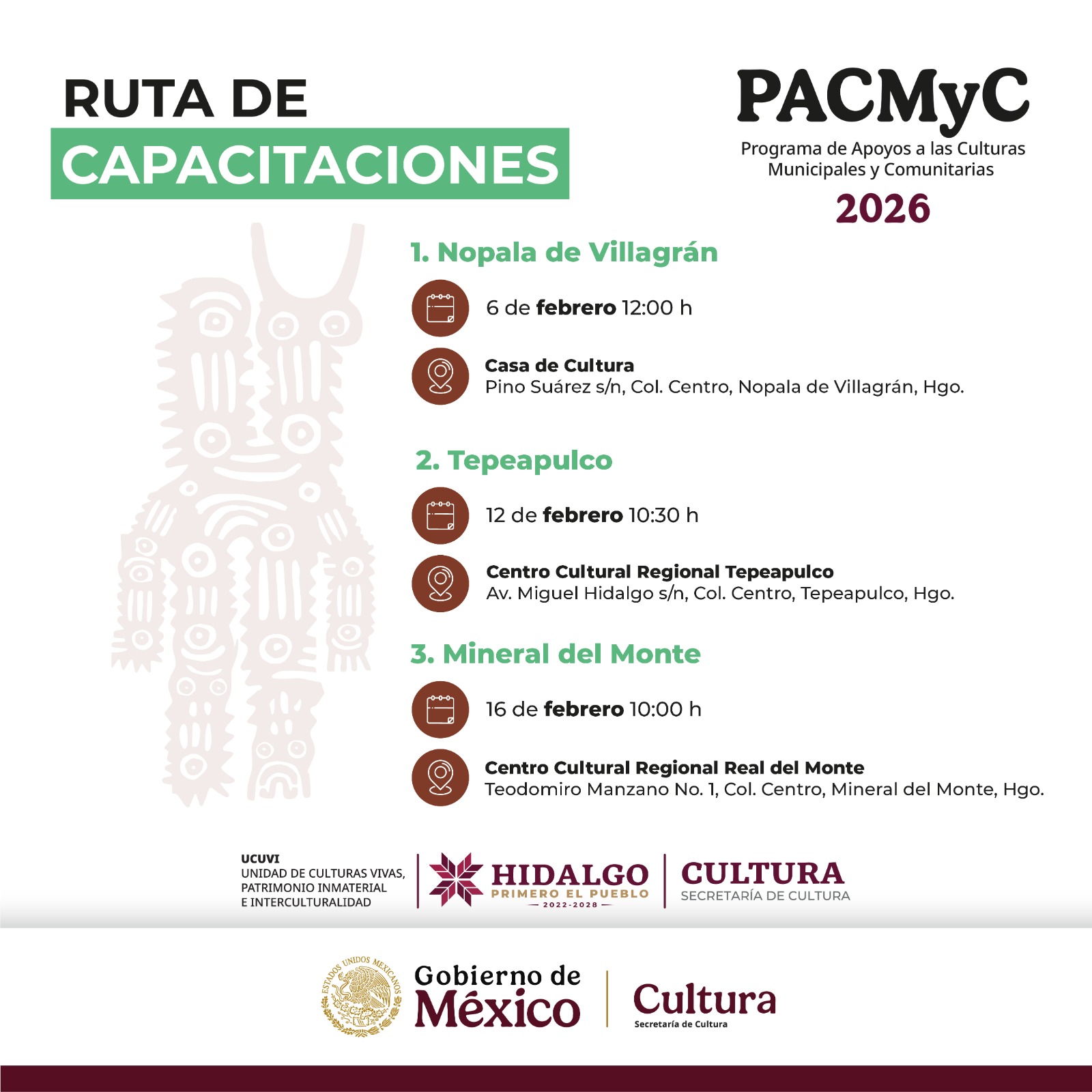 Para conocer fechas, horarios y sedes específicas de cada municipio, se invita a consultar las redes sociales oficiales de la Secretaría de Cultura de Hidalgo, donde se difunde de manera permanente la información de esta ruta.
