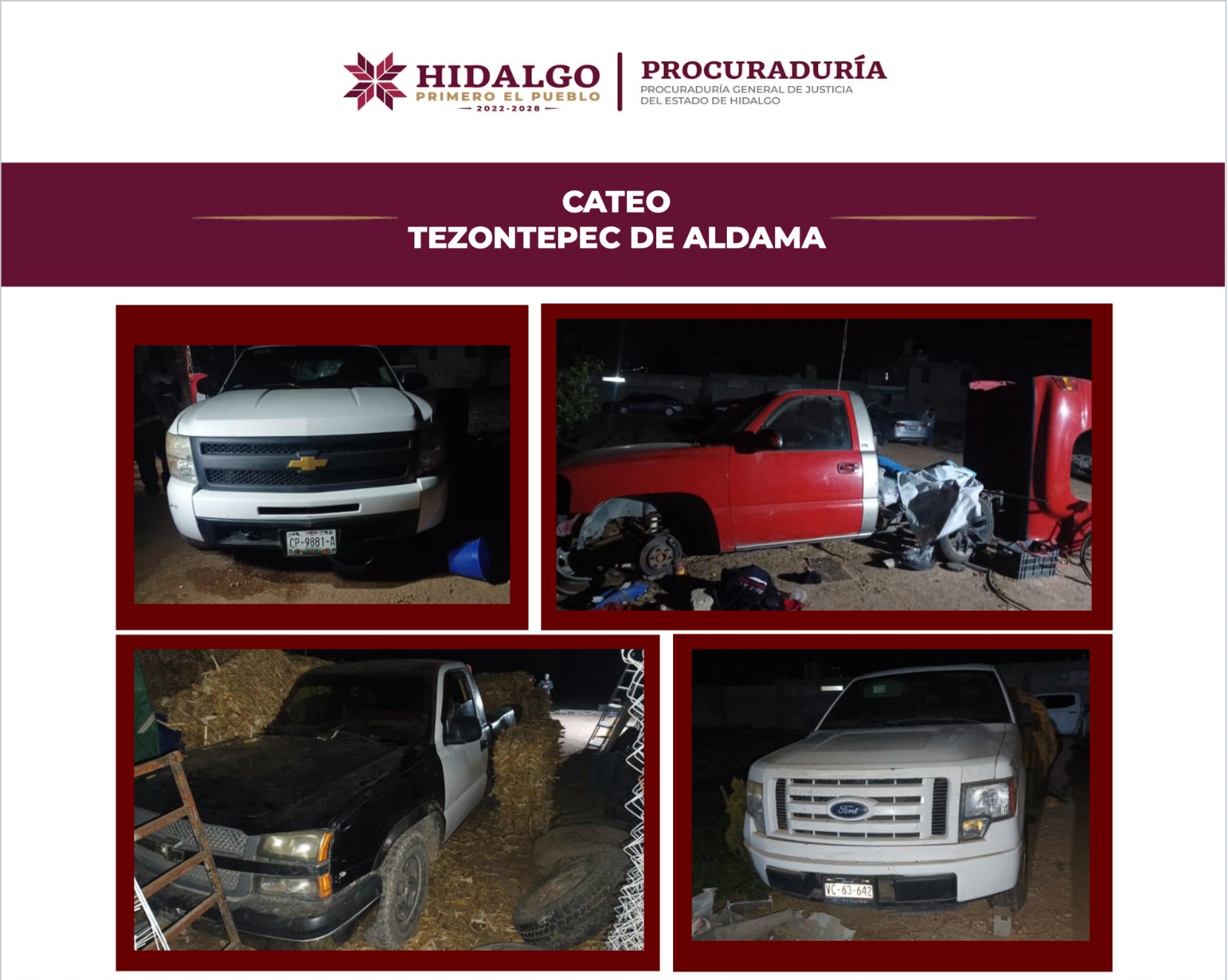 En Tezontepec de Aldama, elementos de la Agencia de Investigación Criminal de la Procuraduría General de Justicia del Estado de Hidalgo detuvieron a una persona de iniciales E. R. R., por encontrarse en posesión de armas de fuego, cartuchos útiles, vehículos con reporte de robo y estupefacientes.