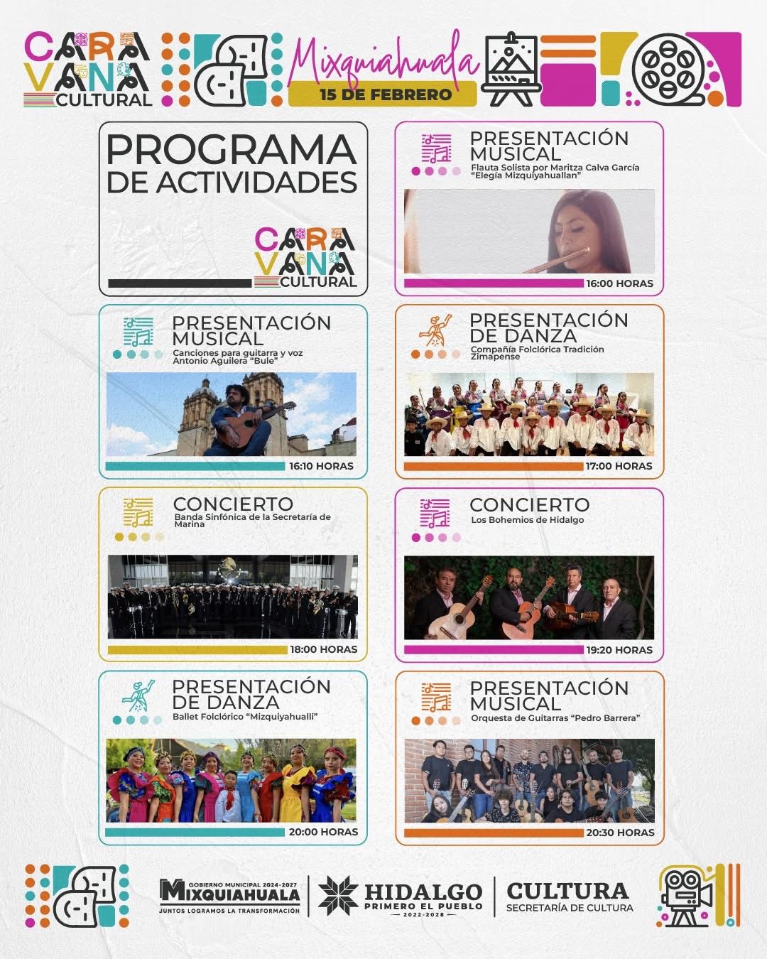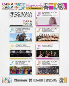 Este domingo 15 de febrero, en el Jardín Principal de Mixquiahuala de Juárez, inician las Caravanas culturales, un programa que recorre distintos municipios de las 10 regiones culturales del estado con el objetivo de acercar a la población una oferta diversa de presentaciones escénicas, expresiones tradicionales, gastronomía y artesanía local.
