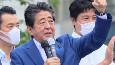 Shinzo Abe fue baleado por la espalda mientras daba un discurso al aire libre en un acto electoral; sufrió un…